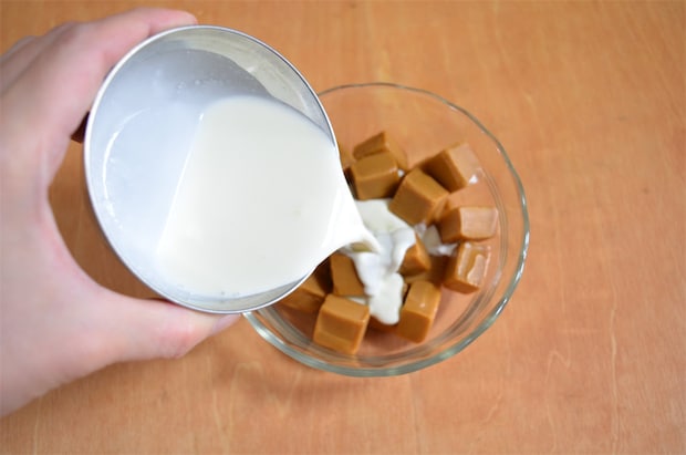 1. 耐熱容器に森永ミルクキャラメルと生クリームを入れて、600Wの電子レンジで1分30秒温めて混ぜる。トロトロになったら冷蔵庫で冷やす。