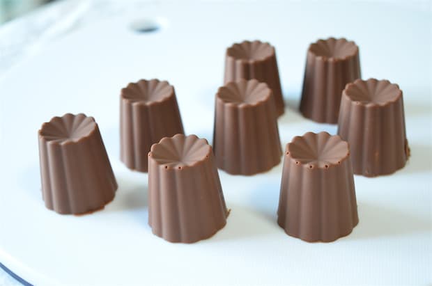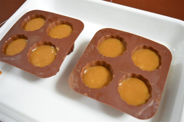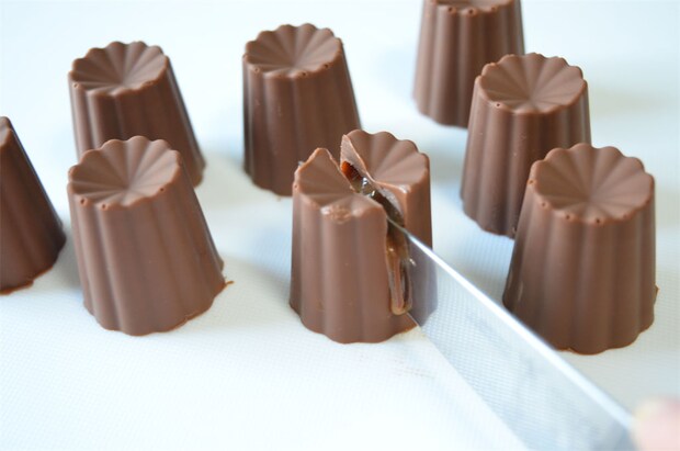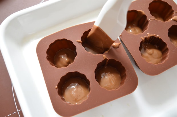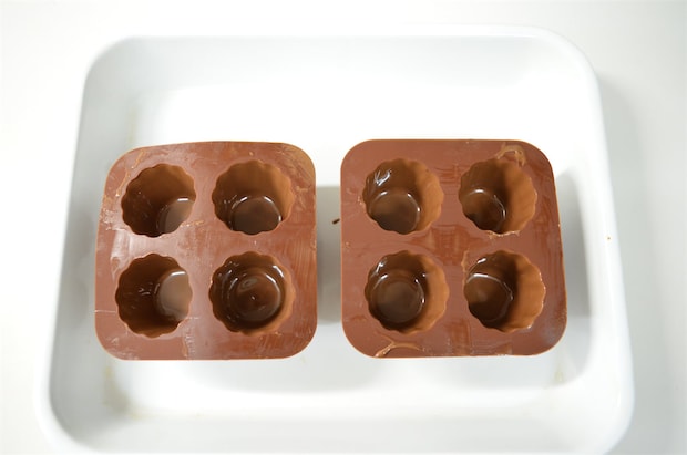 2. 湯せんで溶かしたダース(ミルク)を型にたっぷり流し込み、型の内側にチョコレートがついたらひっくり返して、余分なチョコレートを落とし、30分~1時間ほど冷蔵庫で冷やす。