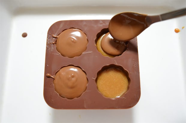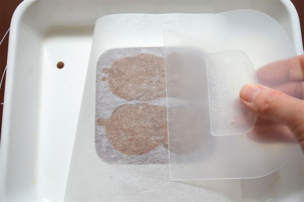 4. 最後に2で残ったチョコレートを再度湯せんして溶かし、型に入れる。その上にクッキングシートでフタをしたら、余分なチョコレートを落とす。