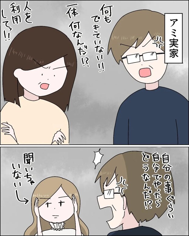 嫁アミさんの強い希望もあり、押し切られる形で息子ショウさん、嫁アミさん、3歳の孫コウくんと半年間のお試し同居をすることになったヨシコさん。息子家族とは適度な距離を保ちたいと考えていたヨシコさんは、自分たちのことは自分たちでして欲しい、と同居のルールを決めますが、同居が始まってみるとほとんどの家事を押しつけられコウくんのお世話も頻繁に頼まれ、ヨシコさんは息子夫婦に振り回されっぱなし。ストレスが募ったヨシコさんは同居解消を申し出ますが、「家が見つかるまで」とショウさんに引き伸ばされ、その後も相変わらずアミさんは何かと理由をつけて家事をやらなかったり、突然コウくんをヨシコさんに預けることが続きました。改善が見られないと思ったヨシコさんが改めて同居解消を訴えるも、アミさんは自分が大変になるから別居したくないと身勝手な主張。何を言っても伝わらないと悟ったヨシコさんは、ついにアミさんのご両親に助けを求めます。ヨシコさんから同居中のアミさん達の様子を聞いたご両親は、アミさん達を自分たちの家に連れていくためヨシコさんの自宅に訪れました。ご両親がアミさんを叱るも、「お義母さん、チクったんですか!?信じられな~い!」と反省の色なし。数々の言い訳を並べるも、有無を言わさずご両親に連れられ、ヨシコさんの自宅から出ていくことになりました。