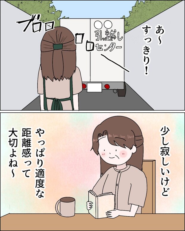 私は、引っ越しのトラックを見送りながら、心の中で「あ~すっきり!」と叫びました。これにて、私と息子家族の同居生活は終了。家族といえども、やっぱり適度な距離感は大切だと学びました。これからも息子家族との関係は続きますが、くれぐれもストレスのない距離感で付き合っていきたいと思います。