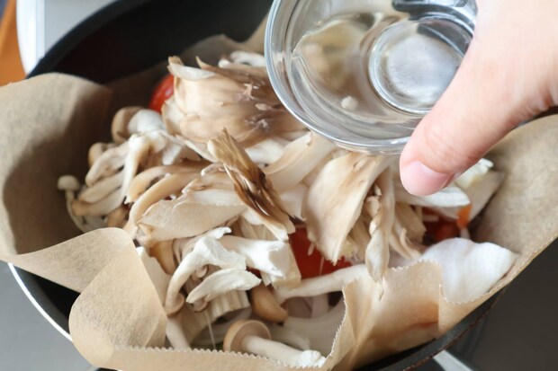クッキングシートの上に食材を重ねて蒸す