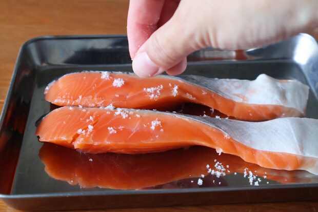 鮭に塩をふる。