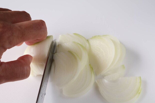 玉ねぎは繊維に沿って薄く切る。