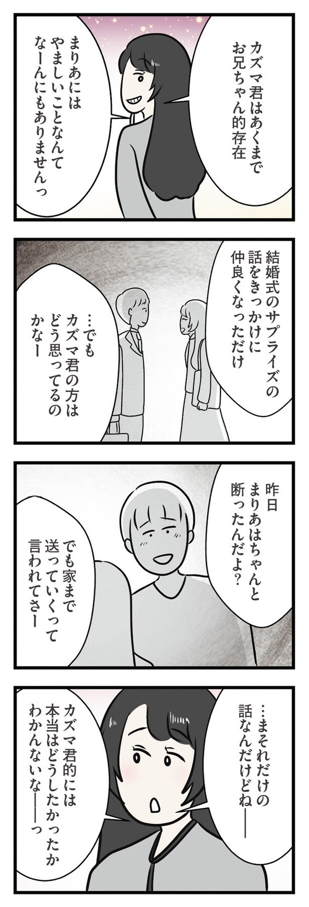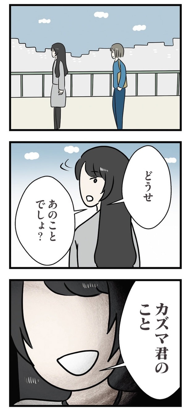 前回、まりあの会社にエリが突撃し、2人は屋上で話すことになった。エリが、あの日カズマと体の関係を持ったかまりあに問いただすと「お姉ちゃんって悲劇のヒロインになるの好きだよね」と笑われてしまう。その他にも次々とエリを煽ってきて…。