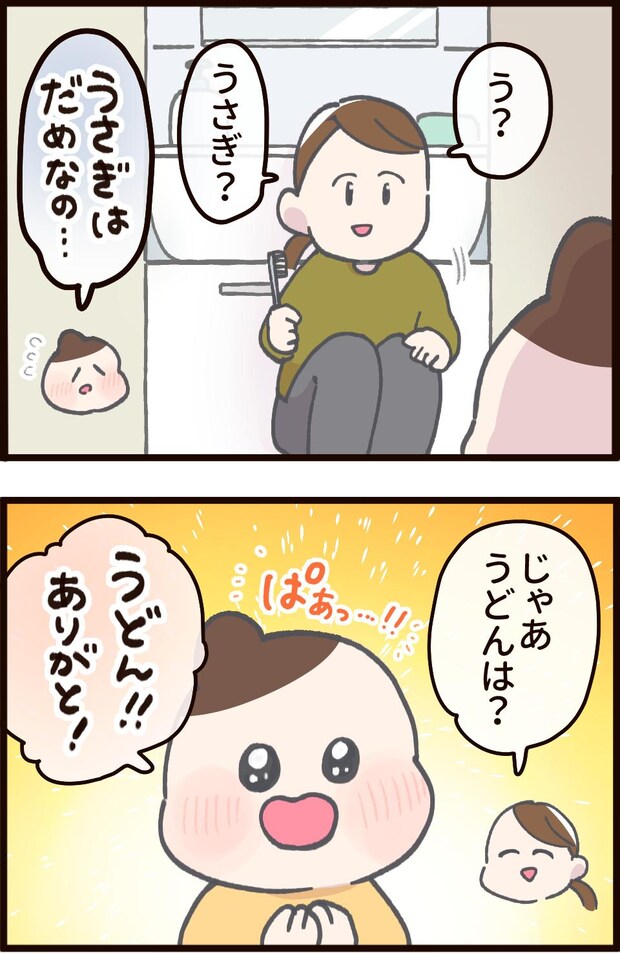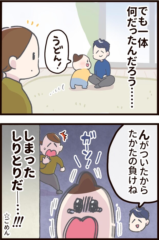 しかし「うどん」は「ん」で終わるため、娘の作戦はあえなく失敗。