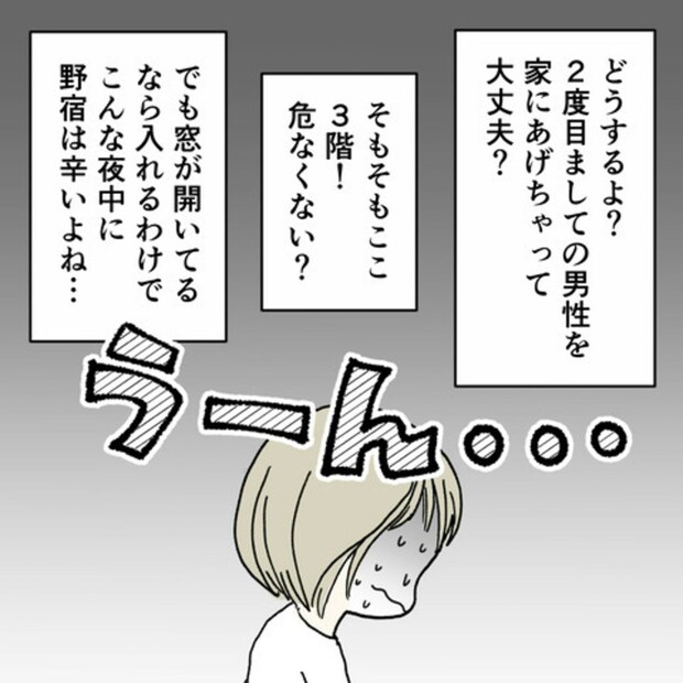 E原さんに協力したい気持ちはあるものの、夜中に男性を家にあげることをためらうS葉さん。こんなときにM生はそばにいません。頼れるパートナーがいてくれらたらと思うS葉さん。