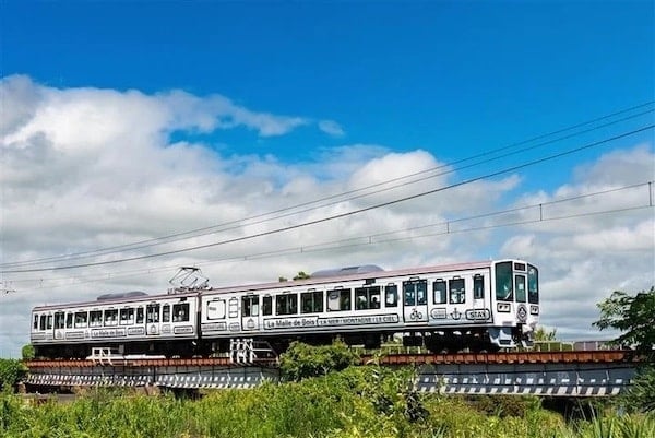 観光列車「La Malle de Bois」は、瀬戸内国際芸術祭総合ディレクターの北川フラム氏がデザイン監修を務めた。旅にまつわる旅情を誘う絵柄や言葉が、白い車体に大胆にデザインされているのが特徴。旅支度をする特別な時間を楽しめ、走る旅の道具箱(トランク)といえる列車だ。