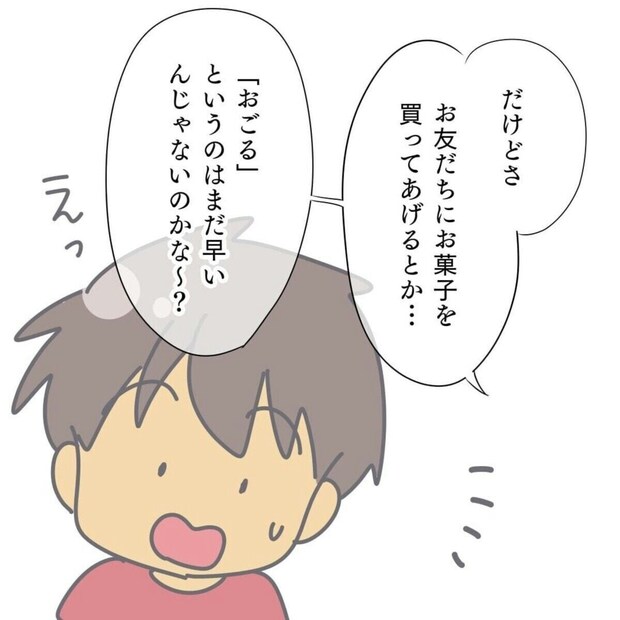 ある日、友だちにお菓子を買ってあげたと報告したタロくん。タロくんはよいことをしたと思い、星河ばよさんに報告をしたようですが星河ばよさんは「おごる」ということはまだ早いと説明しますが…?