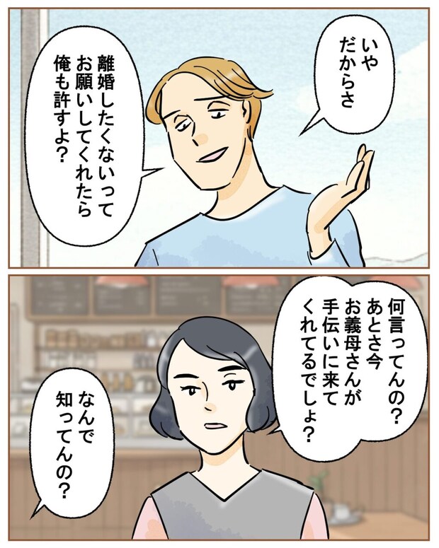 離婚の話し合いのためにカフェで会うことになったナズナさんとツカサさん。ナズナさんがまだ自分のことを好きだと思い込んでいるツカサさんは「ナズナの考えを尊重するよ」と理解のあるような口ぶりで離婚に同意しましたが、ナズナさんの冷静さを見て不思議がり「離婚したくないってお願いするなら一緒にいてもいいんだよ?」と勘違い発言。ナズナさんは冷めた目で拒否しますが、ツカサさんはしつこく「俺と別れたら次の相手とか見つからないんじゃない?」「俺みたいに専業主婦でいいよって言う男なかなかいないよ?」と言います。ナズナさんは「何言ってんの?」と相手にせず「今お義母さんが手伝いに来てくれてるでしょ?」と話題を変えると、ツカサさんは「何で知ってんの?」と驚きました。