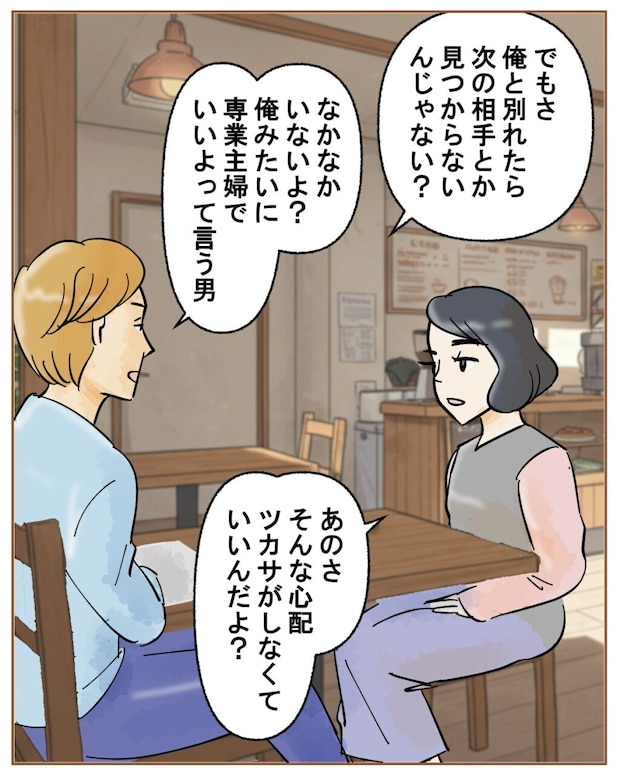 それでもツカサは「でもさ、俺と別れたら次の相手とか見つからないんじゃない?なかなかいないよ?俺みたいに専業主婦でいいよって言う男」と私に思い留まるように言ってくるので「あのさ、そんな心配ツカサがしなくていいんだよ?」とはっきり言いました。離婚後の私の心配など大きなお世話です。