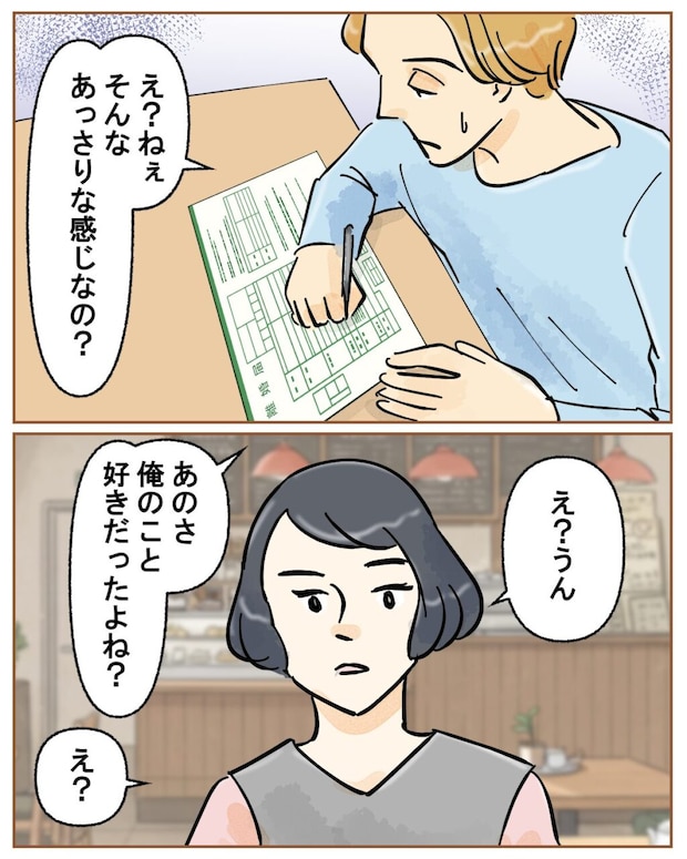 ツカサが離婚届に記入しながら「え?ねぇ、そんなあっさりな感じなの?」と探るように聞いてきたので「え?うん」と真顔で答えると、「あのさ、俺のこと好きだったよね?」と言ってきました。私はツカサが何を言いたいのか分からず「え?」と聞き返しました。