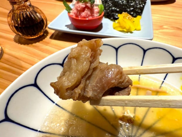 牛すじベースの出汁が体にしみわたるおいしさで、これだけで日本酒1杯空いてしまいそうな勢い。牛の甘さとコクを存分に味わえます!