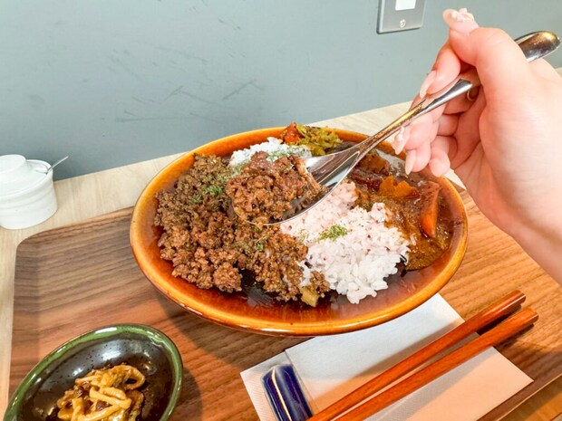 人気メニューは、キーマカレーと糀野菜カレーの「2種あいがけカレー(1500円)」。このカレー、実は“辛くない”んです。