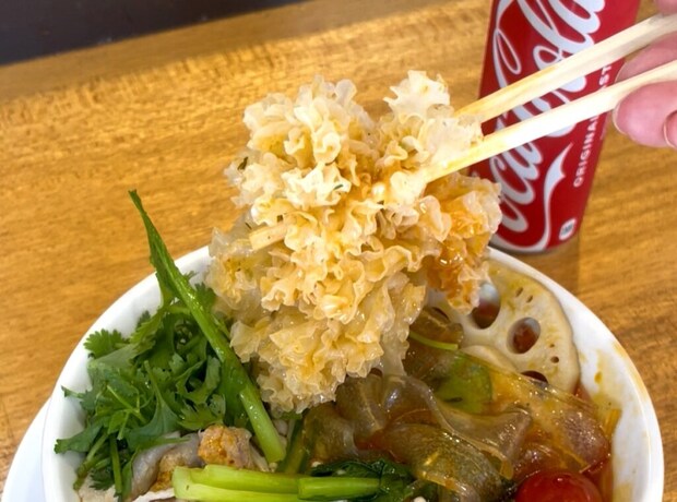 トマト、豚肉、白きくらげ、レンコン、パクチーなど具材がたっぷり入っていて、どれも存在感があって美味しい!