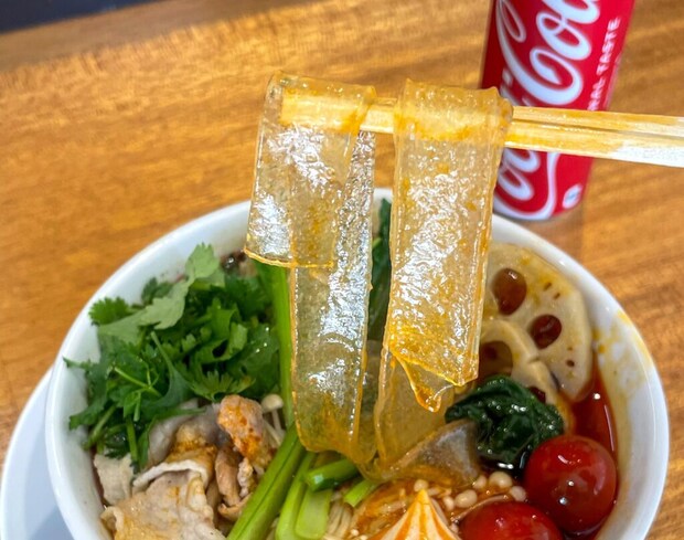 麺は「タンミョン」と呼ばれる、きしめん風の麺で、もちっとぷるんとした食感がクセになります!