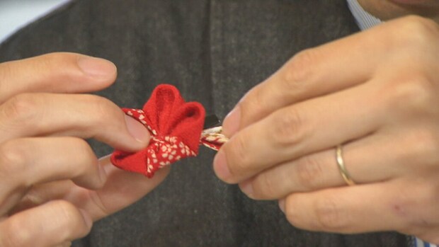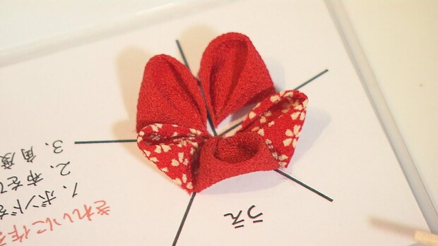 つまみ細工とは、正方形の布を折りたたみ、花弁や葉の形に仕上げる技法。