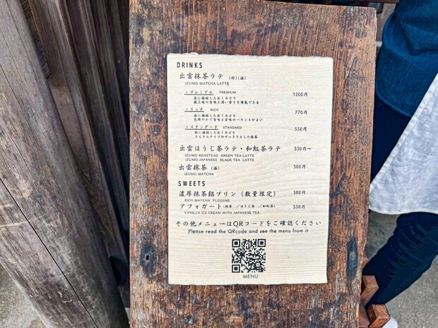 看板メニューの「出雲抹茶ラテ」は、お好みに合わせて3つの味わいから選べます。