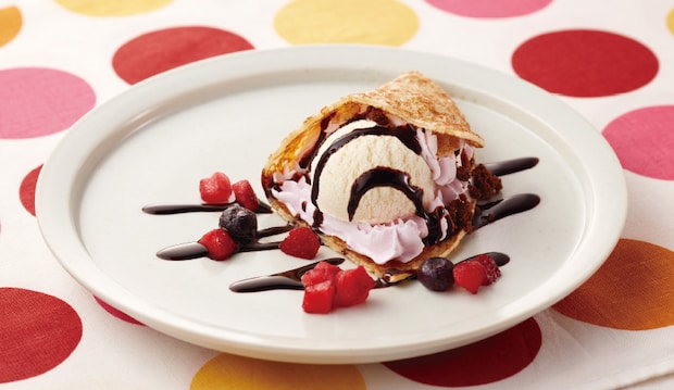 ストロベリーホイップとバニラアイスを、もちもちとした食感のクレープ生地で包んだ。