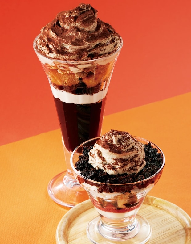 ココアパウダー、ティラミスクリーム、バニラアイス、玄米フレーク、コーヒー、カットパンケーキ、チョコレートシロップ、ブラウニー、北海道産マスカルポーネチーズ、珈琲ゼリーを組み合わせた。