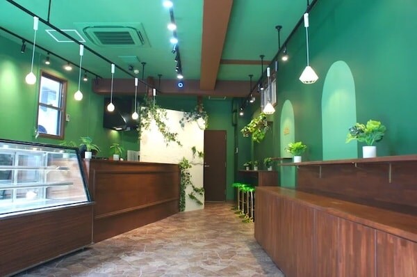木の温もりとグリーンを基調にした内装は、まるで小さな温室のような心地よさ。カウンター5席のイートインスペースでは、オリジナルブレンドコーヒーや地元ドリンク・アルコール飲料とともに、ゆったりとスイーツを楽しめる。