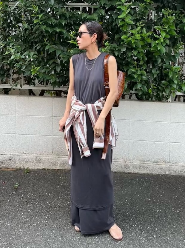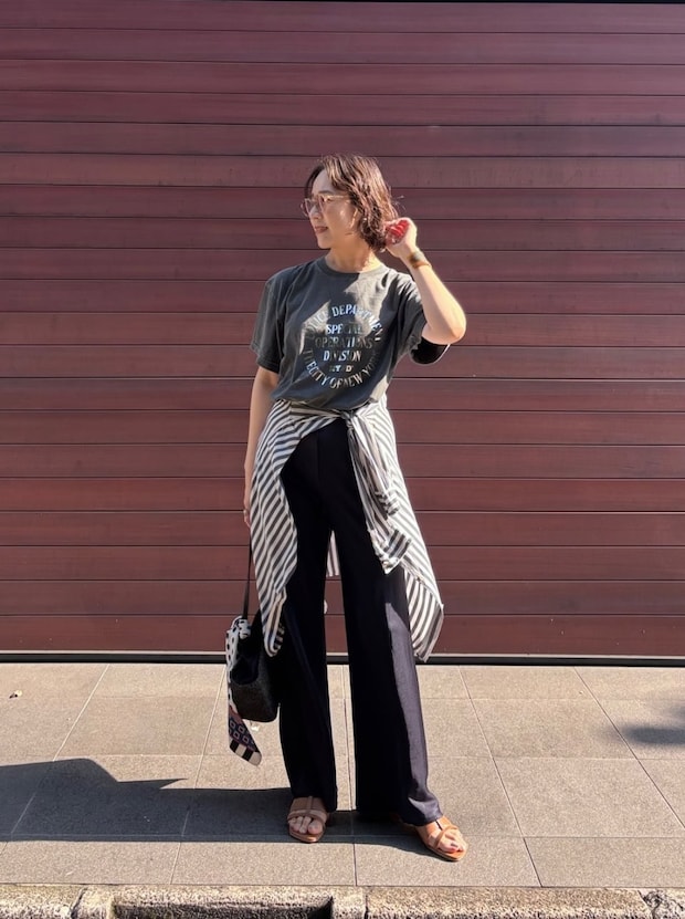 「腰巻きシャツ」も、今年はトレンドスタイルに! 少し物足りないなと感じたときにひと巻きプラスするだけで、今っぽさとメリハリを出せるの人気のアレンジです。