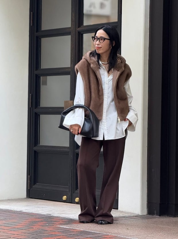 オーセンティックな白シャツにモダンなアクセントをプラスするファーベスト。シャツの軽やかさはそのままに、秋らしい暖かみのあるコーディネートに仕上げて。
