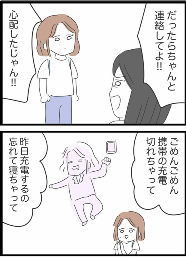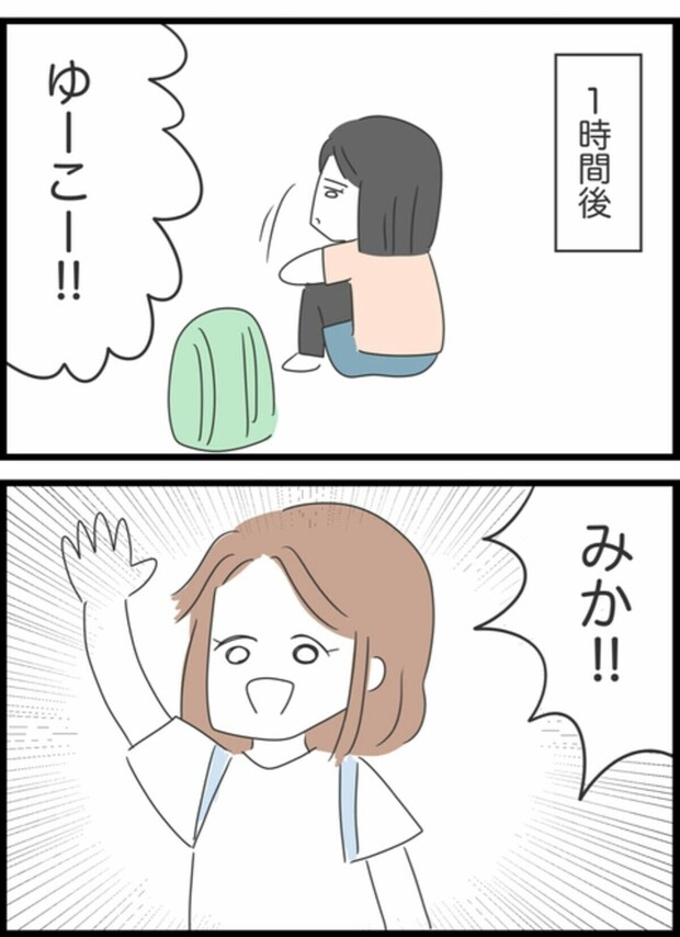 集合場所である登山口でみかを待っていたゆうこ。しかし、時間になってもみかは現れず、携帯に電話しても音信不通。遅刻はあっても連絡がつかないことは初めてだったため、ゆうこはどうするべきか頭を悩ませます。行き違いになるよりはとその場で待つことにしたゆうこ。しかし、待っている間もみかに何かあったのではと悪いことばかりが頭をよぎっていました。遅刻はいつものことでも、連絡がつかないというのは不安になりますよね。