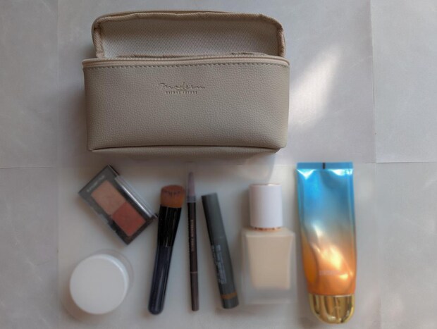 日焼け止め、リキッドファンデーション、パウダー、眉マスカラ、アイブロウペンシル、ブラシ、アイシャドウがすっきりと収まりました。