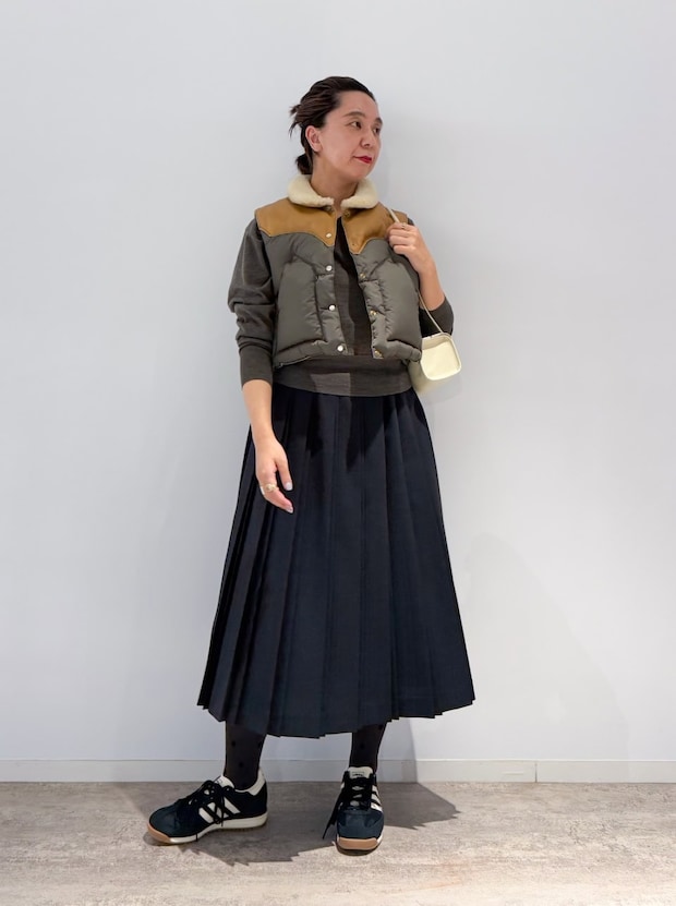 「シックにもカジュアルにも合わせやすいアディダス別注スニーカーを中心に、ミックスコーディネートに仕上げました。『ニット+プリーツスカート』のベーシックスタイルを、短丈のダウンベストとスニーカーで程よくハズしたのがポイントです」