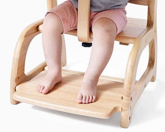 また、座り慣れていない子どもの足裏全体をしっかり置くことができる広い足置き板があり、足元が安定することで姿勢も整う。