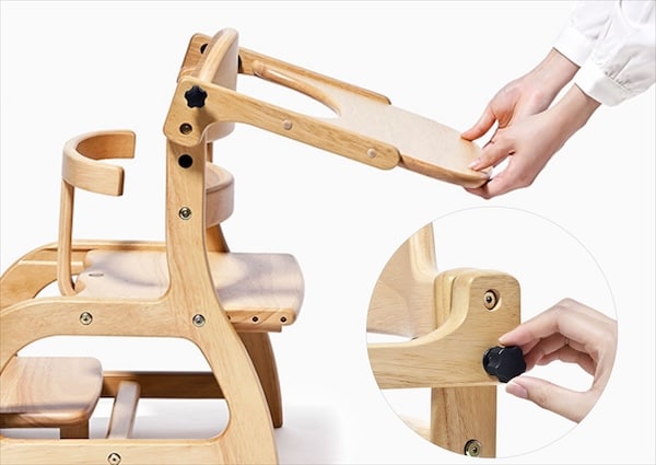 子どもの成長や身体の大きさに合わせて、座板の奥行きが4段階(17、20、23、26cm)、足置き板の高さが3段階(9.5、6.5、3.5cm)で調節が可能。