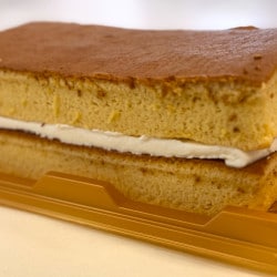 アカシア蜂蜜を入れて焼き上げたフワフワの生地に、クレームシャンティ(甘みを加えた生クリーム)をサンド。バニラ風味のやさしい味わいとしっとりとしたカステラが相性抜群で、シンプルなのにここまで贅沢に感じられるカステラは珍しいかも。