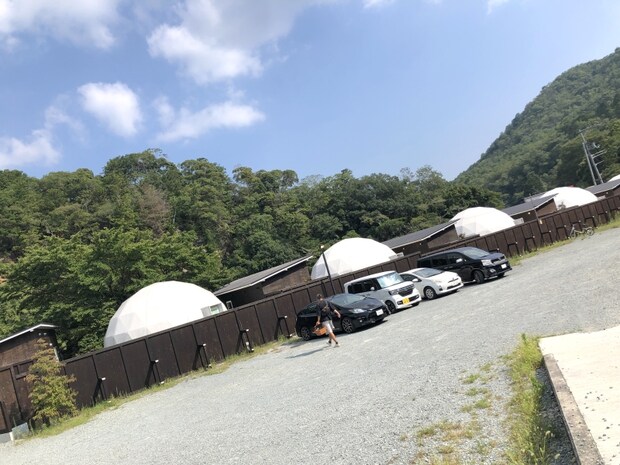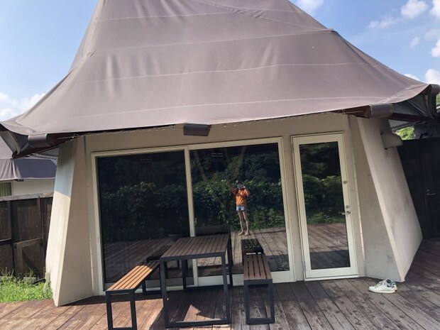 直径7mドームテントの「アクアドーム」が通常のグランピング施設。お部屋は2タイプあり、1つは川沿いに専用デッキがあり、川のせせらぎと共に渓谷の風景美が楽しめます。(ワンちゃん不可です)