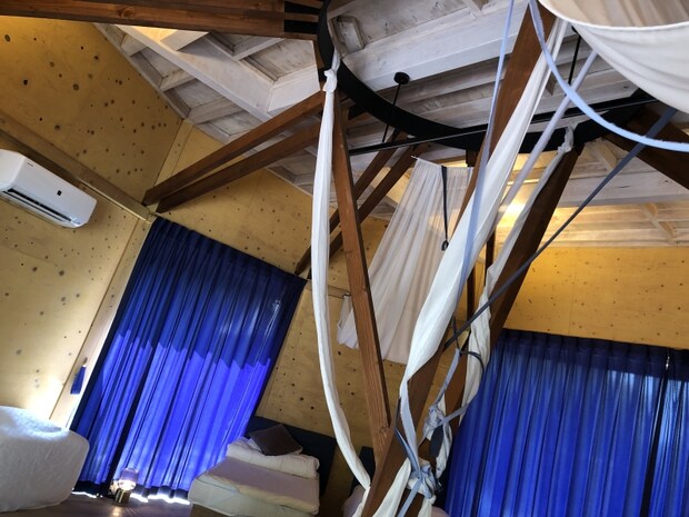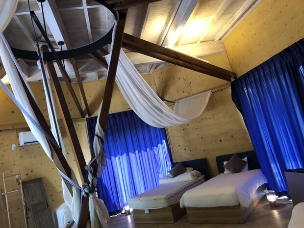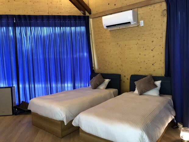 お部屋の中の装飾はそれぞれのテントで違うかもしれませんが、ラグジュアリー感のある内装でワクワクします。もちろん、こちらの寝室にもエアコンが完備。