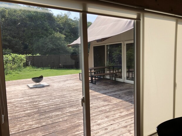 最上級スイートテントの「スイートテラス」は、全面ガラス張りのプライベートダイニング“ヒカリのテラス”でBBQが楽しめます。4名様までと8名様までの2タイプです。(ワンちゃん不可です)