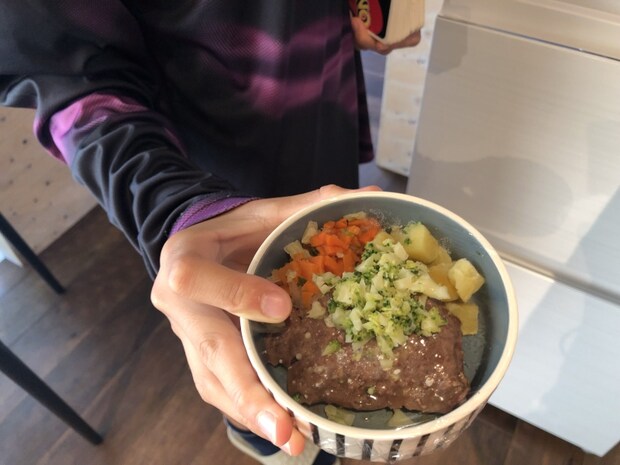 そのワンちゃんご飯とは「丹波産鹿肉バーグと温野菜」という、なんとも美味しそうなご飯。鹿肉、鹿骨、内臓を黄金比率でミックスされており、日本鹿がもつ野生本来の味と香りに温野菜が添えられています。