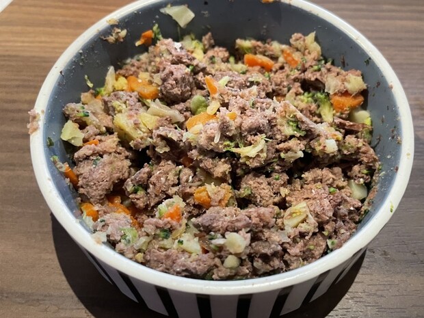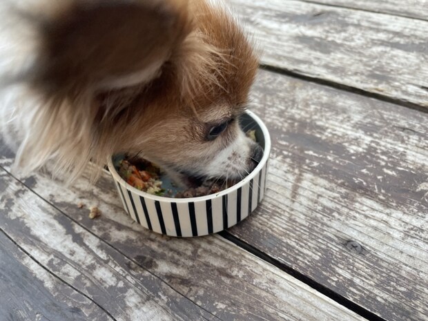 上の写真は小型犬用の100g。人間が見ても美味しそうです。このままあげると、せっかくのバーグを丸呑みしてしまいそうなので、細かくして、野菜と混ぜてあげるのも良いかもしれません。