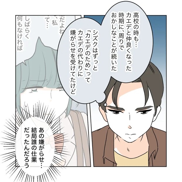 高校時代、お互いに好きなのに言い出せずにいたワタルとカエデ。ある日カエデに『ワタルに近づくな』と脅す手紙が届き、さらにカエデの妹サクラが学校の階段から不審な落ち方をしてケガをしたことで、カエデは理由を告げられないままワタルと距離を置きました。念のためサクラの彼氏ショウマと毎日一緒に帰るようになったため、サクラのことを知らない女子たちはショウマとカエデが付き合っているのではと噂をし始めました。その頃シズクは、両想いのワタルとカエデがまた一緒にいられるように協力するふりをしつつも、ワタルとカエデどちらにも上手く嘘をついて、ワタルと一緒にいるようになったのです。サクラとショウマはシズクの自作自演を疑いましたが、真相は分からず、ワタルとカエデは別の人と付き合ってしまったとお互いのことを誤解したまま卒業して大人になり、ワタルはシズクと結婚し、ショウマとサクラは結婚していました。久しぶりにカエデが地元に戻って再会したワタル、シズク、カエデ。小学生の娘同士が同じクラスで仲が良いため、カエデはシズクと関わらない訳にはいかず誕生日会に呼ばれてもシズクへの疑惑が拭いきれずに警戒してしまいました。シズクの行動を探るため、カエデはワタルと連絡先を交換しました。