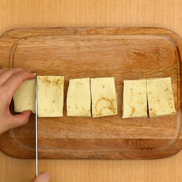2. 別の耐熱容器に高野豆腐を入れて、かつおだしを加える。ふんわりとラップをし、600Wのレンジで2分加熱してもどす。粗熱をとり、水気を軽くしぼり、半分に切る。