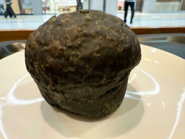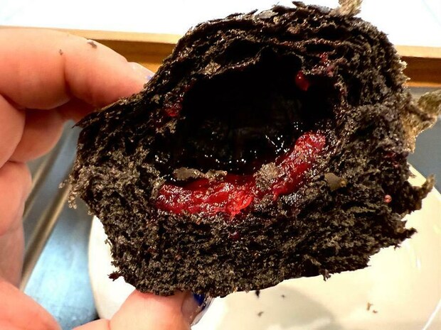 写真は、半分に切った状態です。真っ黒なチョコレートデニッシュ生地の中には、なにやらジャムのようなものが入っているのが見えます。
