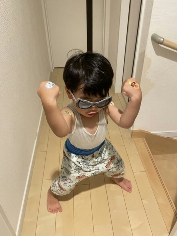 両手と両肩にお気に入りのシールを貼って、イカしたサングラスをかけ、戦闘ポーズをきめる3歳児さん。子どもにとっては全力でカッコ良いヒーローに変身しているのです。完全にヒーローになりきっているため、真剣さと無邪気さに思わず笑顔になっちゃいますね。どんな栄養ドリンクより効くかもしれません。