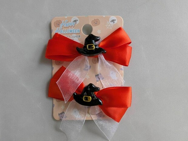 大きなオレンジのリボンに魔女帽子のチャームが付いたヘアピンもおすすめ。