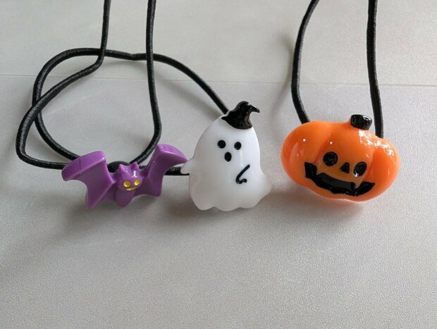かぼちゃ・おばけ・こうもりのモチーフがセットになったゴムは、かわいさ満点!