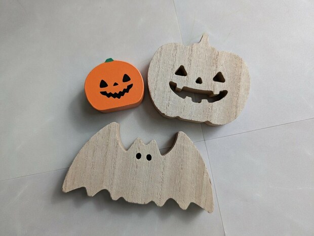かぼちゃやこうもりをかたどった木製オーナメントで、ナチュラルな木の質感が特徴。
