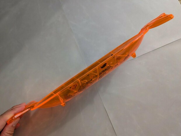 大きなキャンディーの形をしたオレンジ色のトレイで、見た瞬間に気分が上がるデザインです。