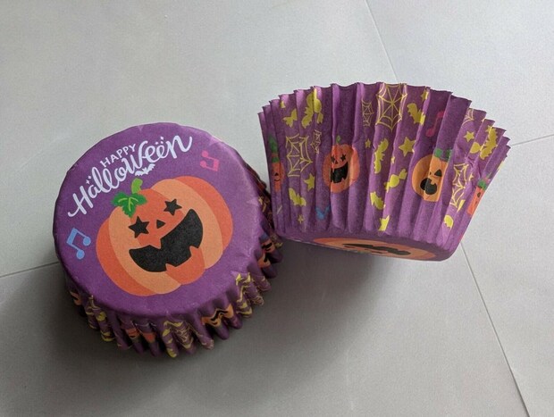 紫やオレンジのかわいい柄つきのケーキカップ。