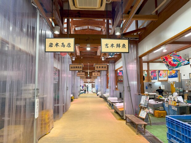 浜田漁港のすぐ目の前という最高のロケーションにあり、その日水揚げされた新鮮な魚介が並びます。