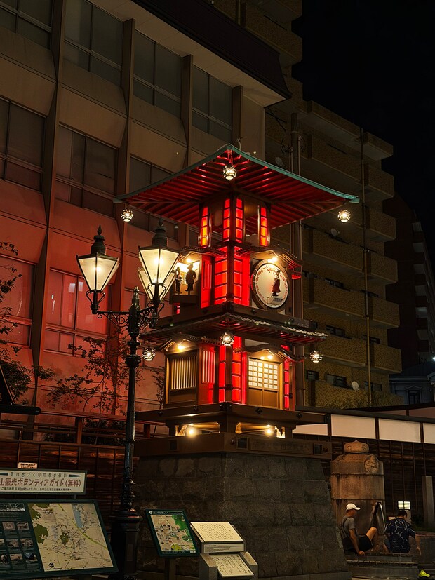 道後カラクリ時計です。商店街入り口東側の足湯のところに設置されています。ライトアップされた夜の時計も雰囲気あっていいですね。