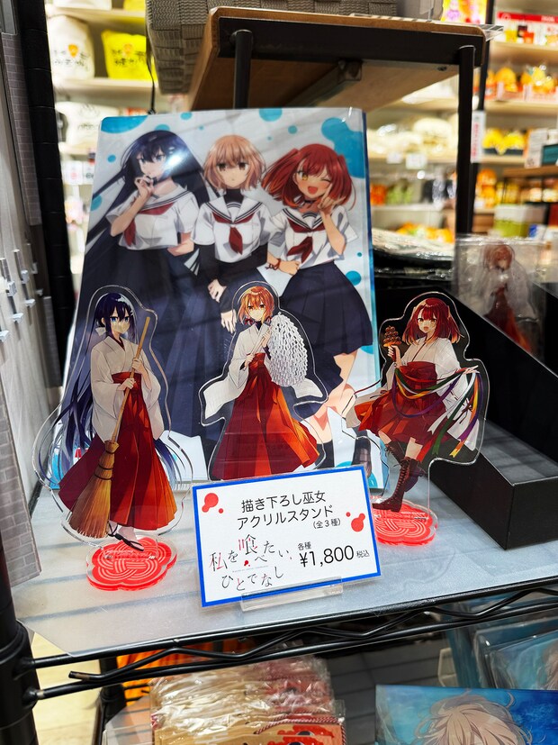 「店内にてグッズ販売中」と書いてあったので店内に足を運ぶと、レジ近くにグッズコーナーが!メインキャスト3人のアクリルスタンドやクリアフォルダーなどが販売されていました。